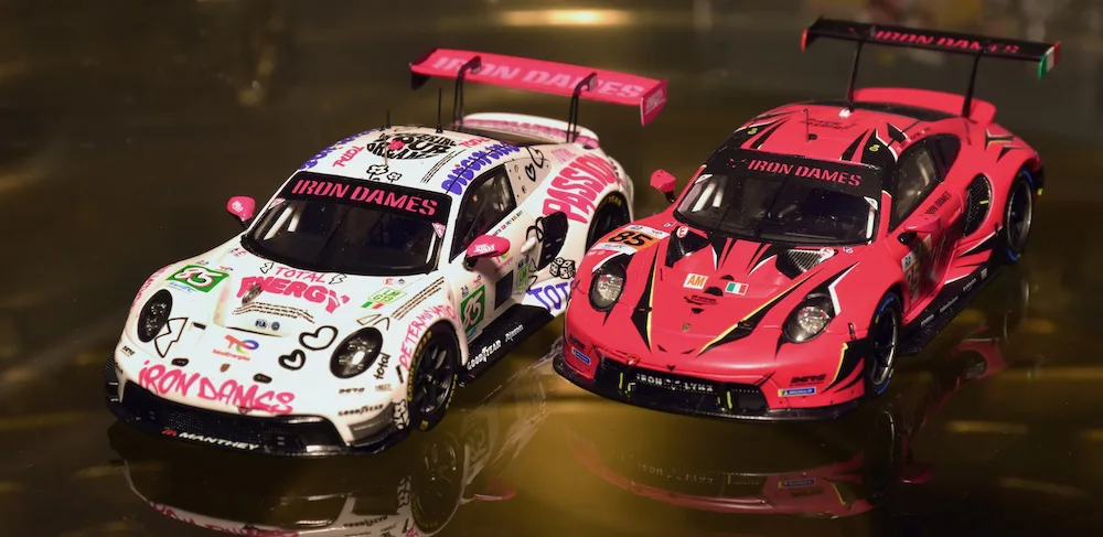 2024 IMSA, Porsche 911 GT3R “Roxy”. AO Racing, founded by P.J. Hyett and Gunnar Jeannette put some remarkable racing cars on track (Gunnar Jeannette has quite a history on this). In 2023 they raced “Rexy”, a green Tyrannosaurus Rex Porsche 911. In fact there were several: a GT3 R for the GTD category in the IMSA Championship and a RSR-19 GTE from Project 1 that has been used in Le Mans. During the season, “Rexy” got company from its pink sister “Roxy”, a GT3 R as well. Later “Spike” joined the family.