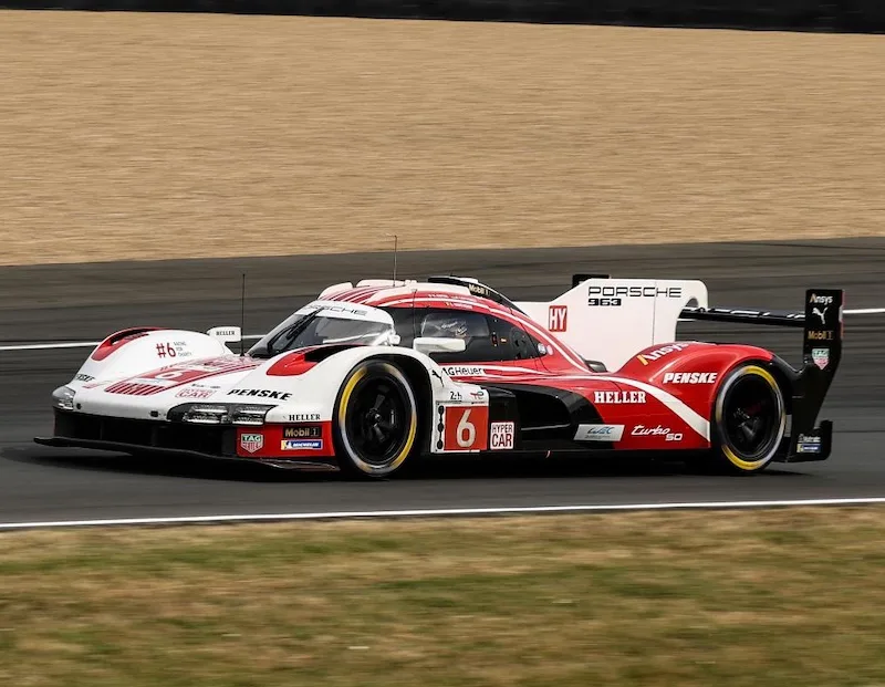 2023 Le Mans 24h, Porsche 963. The Porsche 963 is an LMDh sports prototype racing car designed by Porsche and built by Multimatic, to compete in the Hypercar and GTP classes in the FIA World Endurance Championship and IMSA SportsCar Championship. The hybrid car uses a twin turbo version of the V8 that powered the RS Spyder and 918 RS. Penske is the Porsche works team and entered 3 cars. Two regular entries from the FIA WEC and a third car that races in IMSA. Jota is one of the customer teams that also races the 963 in the FIA WEC Hypercar category.
