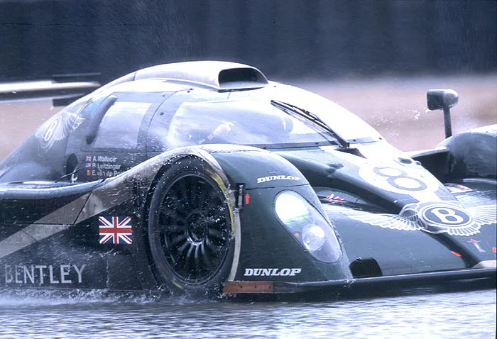 2001 Le Mans 24h, Bentley Speed 8. Audi wanted to revive the Bentley brand by racing it at Le Mans, but it wasn’t supposed to threaten Audi’s Le Mans victories. So the Audi R8C was used as inspiration to build the beautiful Bentley Speed 8 which used the same Audi powerplant. The Bentley’s made a fine debut in the wettest Le Mans in years; the #7 had to retire with a broken gearbox (also the only weak point of the Audi’s), but the #8 car finished 3rd, 14 laps behind the two Joest Audi’s.