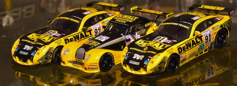 2003 Le Mans 24h, TVR Tuscan 400R. TVR was one of the last small British manufacturers that managed to survive, until it would be bought by a Russian banker in 2004 and in 2007 the story ended. But in 2003, TVR was present at Le Mans with the Tuscan 400R, powered by their speed-6 engine. The TVR’s matched the speed of the slower Porsches and Ferraris and were faster than Spyker, but a crash and lack of reliability made that none of the DeWalt sponsored cars finished.