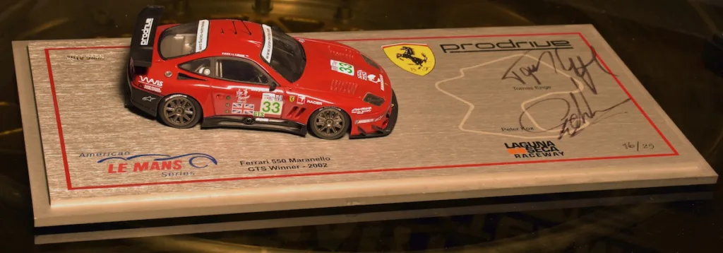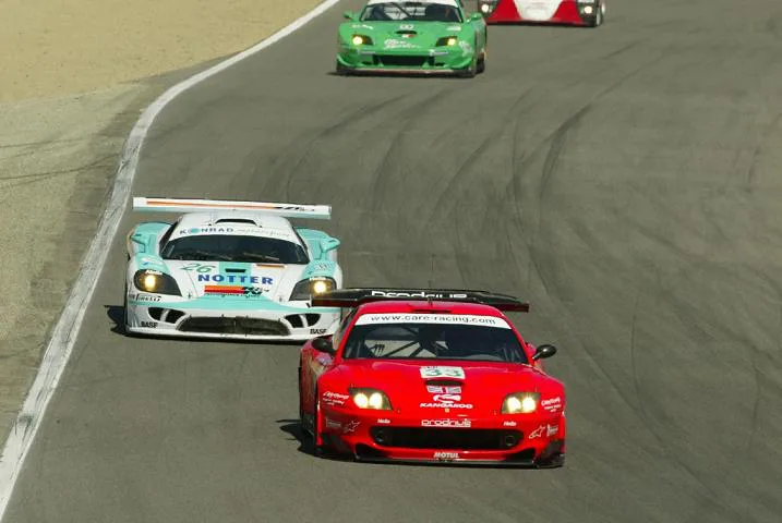 2002 ALMS Laguna Seca, Ferrari 550 GTS Maranello. Also active in the American Le Mans Series was this Maranello. It was developed by Care and run by Prodrive and competitive from the start. It came to the ALMS and beat the Corvettes on home ground in the Laguna Seca race.