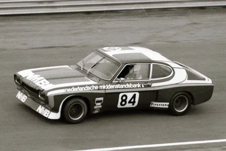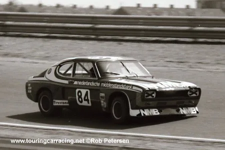 1973 Dutch touring cars Zandvoort, Ford Capri 2600 RS. Nico Chiotakis raced the bright green TEAM 4711 lightweight Capri in 1972 in the Dutch touring car championship. In 1973, he switched to a Porsche 911 RSR and won two races. Han Akersloot took over the Capri with support from NMB, a Dutch bank and updated it with 1973 body work. The championship consisted of only 6 rounds and Akersloot won three, taking the championship.