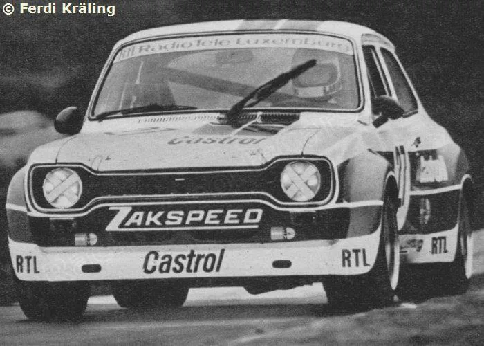 1977 European Touring Car Championship Nürburgring 4h, Ford Escort RS 1800. Zakspeed was active in the DRM Championship of 1977 with their very fast group 5 cars. For the ETCC race they entered two group 2 Escorts in the same livery. Müller andSchommers retired, while Heyer and Hahne (who also drove in the DRM) with the #26 car finished 3rd and won their category.