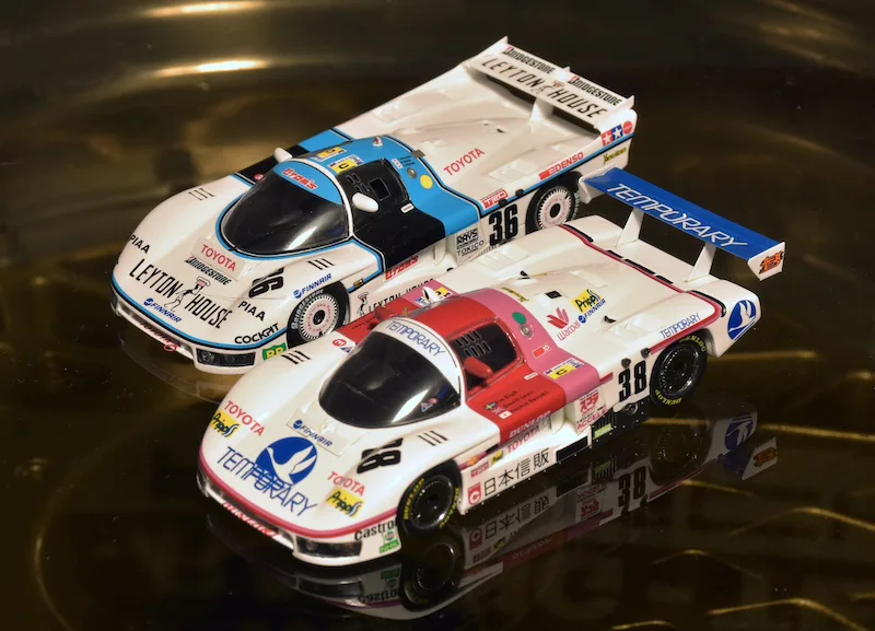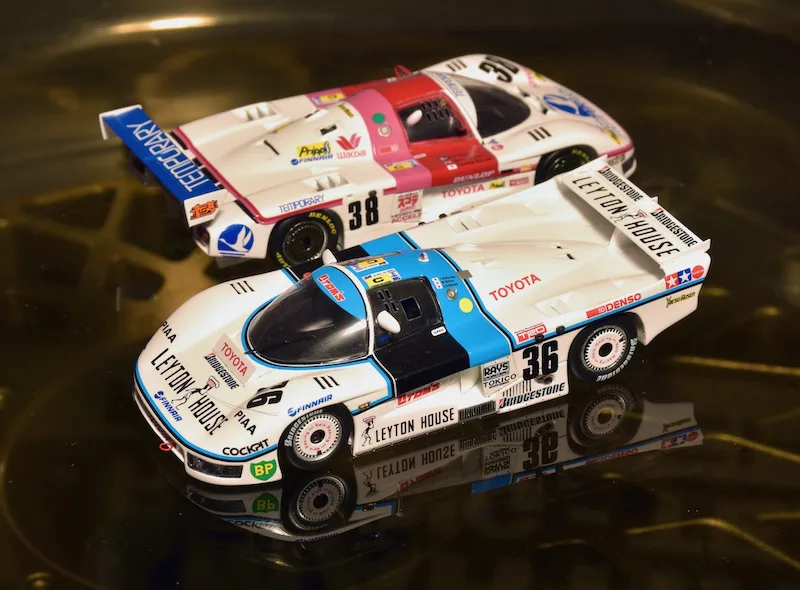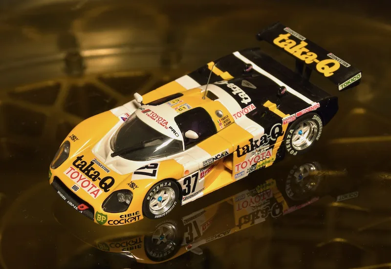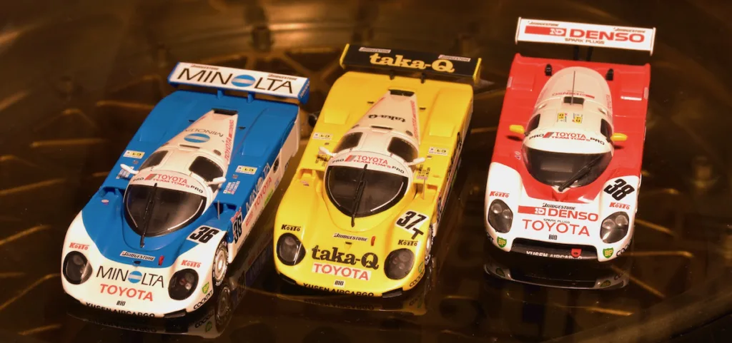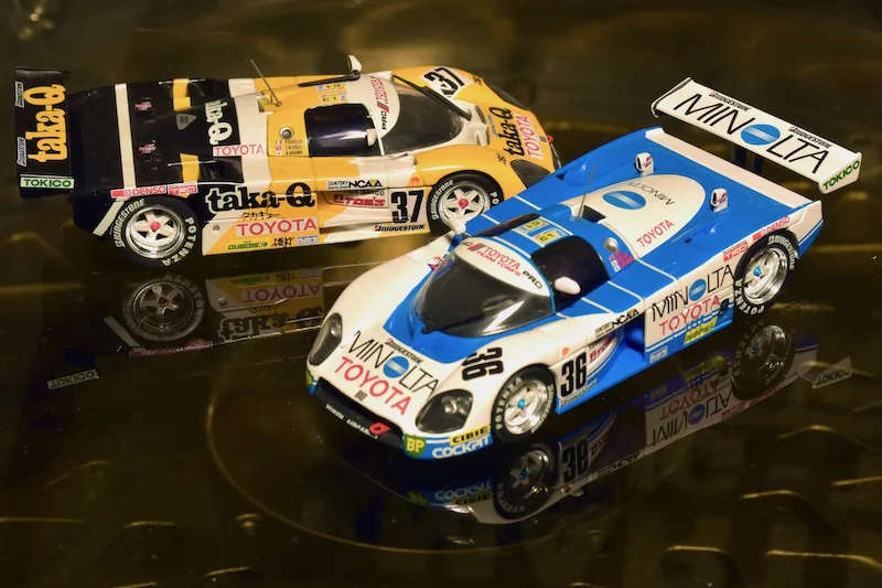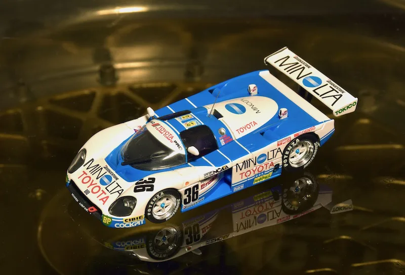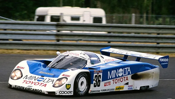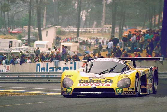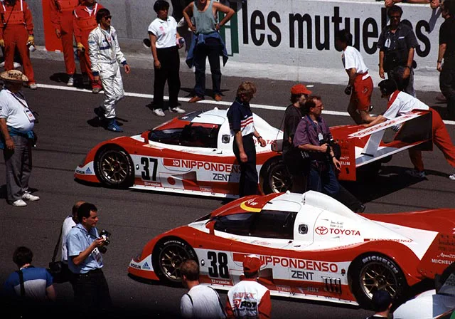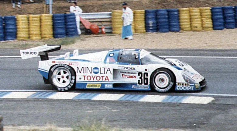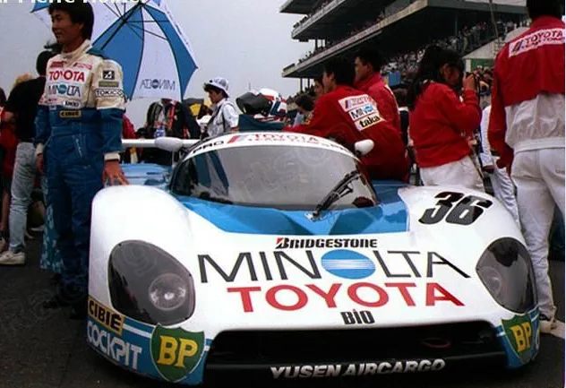 1988 Le Mans 24h, Toyota 89C-V & 88C. Toyota entered no less than three cars this year. Two were equipped with a new 3.2 liter V8 engine. It still lacked speed and reliability compared to Jaguar, Porsche and Mercedes. The blue Minolta car retired with a broken engine. The Taka-Q car is the 37T which was used in practice only. The #37 without T crashed early in the race.