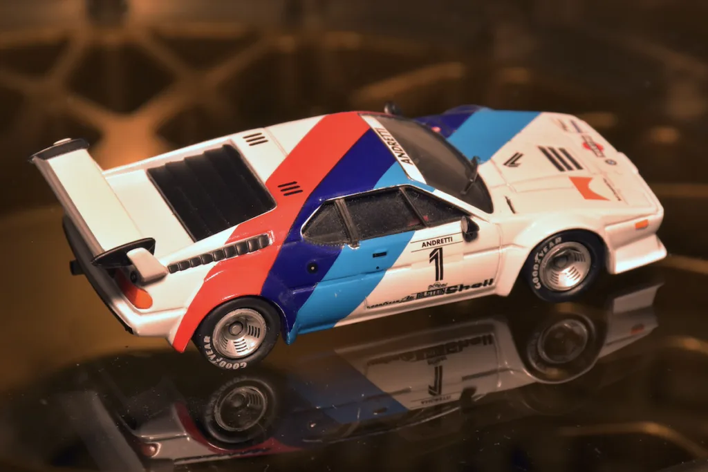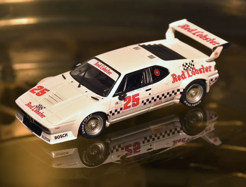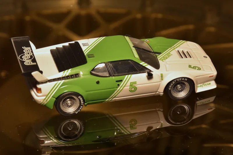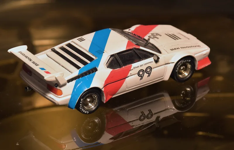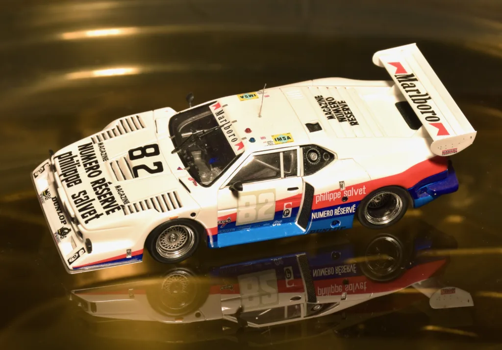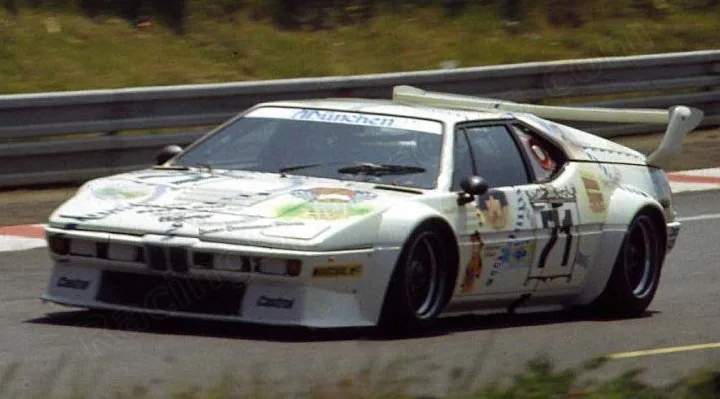 1980 Le Mans 24h, BMW M1. The BMW M1 is famous from the Procar Championship. A racing series in which regular top drivers competed against formula 1 stars that were offered a factory car. In Le Mans the cars raced in similar specs – so including the large rear spoiler – in the IMSA GTX category.