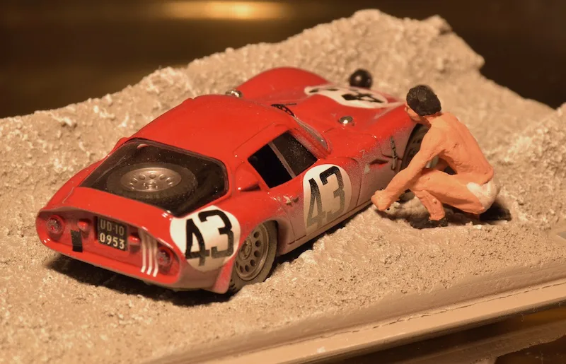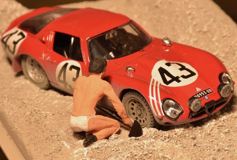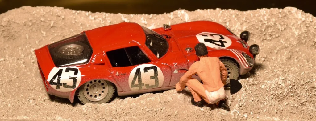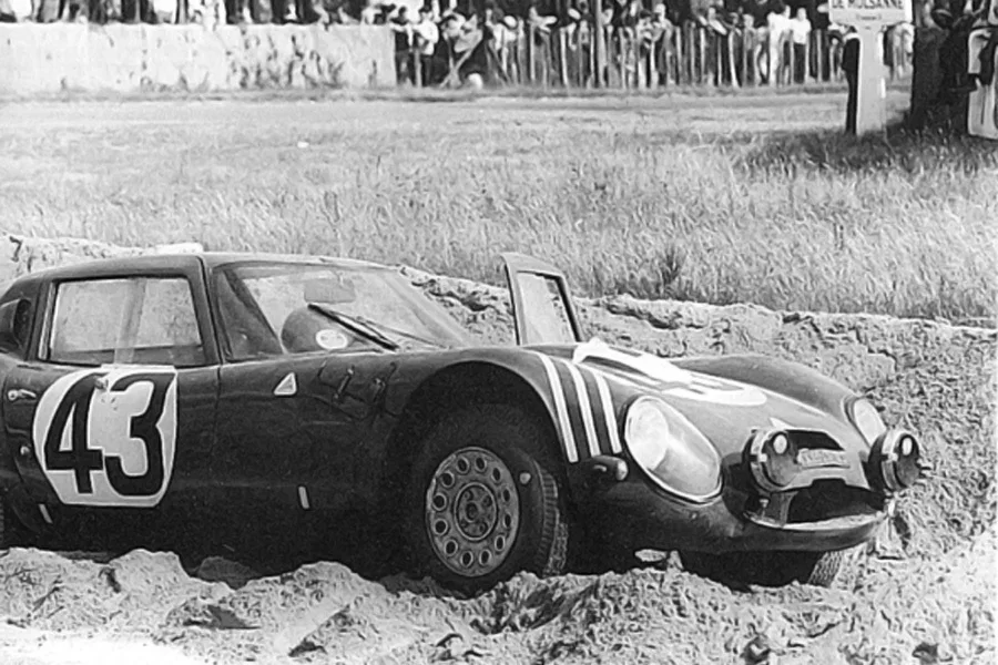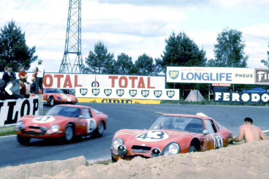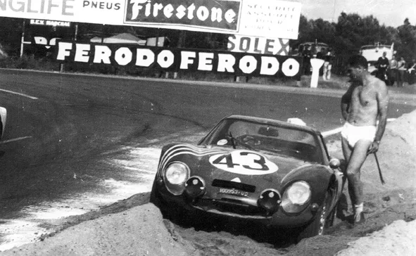 1965 Le Mans 24h, Alfa Romeo TZ2. Nowadays we have escape roads and when a car comes to a halt, it’s being salvaged by the track marshals during a (virtual) safety car. In 1965 things were different: At the outside of Mulsanne corner was a large sand trap and when a car got caught, you had to dig it out your self while the race just went on. This happened to Teo Zeccoli in the first lap. It was so warm, he even took off his racing suit when trying to get the car free from the sand.