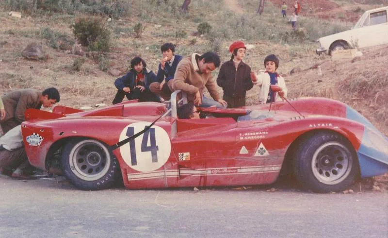 1970 Targa Florio, Alfa Romeo Tipo 33/3. The Targa Florio is a very demanding track where the slightest mistake can have great consequences. Toine Hezemans went off track with his Alfa Romeo Tipo 33/3 and damaged the suspension.