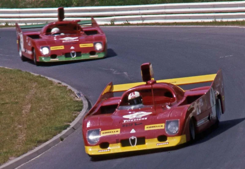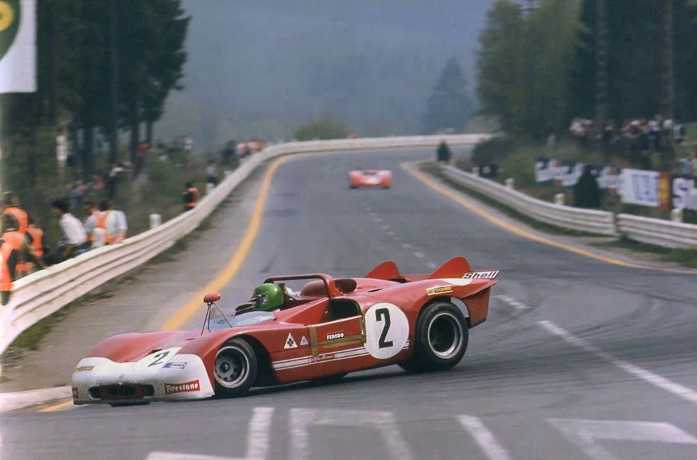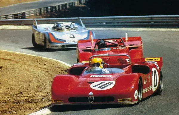 1971 Nürburgring 1000 km, Alfa Romeo Tipo 33/3. The 1971 version of the Alfa 33 was very successful, beating Porsche three times. Rolf Stommelen qualified this car on the front row at the Nürburgring but failed to finish due to engine problems. His teammates finished 4th and 5th behind the Porsche 908/03’s that took revenge for losing the Targa Florio. Gijs van Lennep was back behind the wheel of a Martini Porsche and finished third.