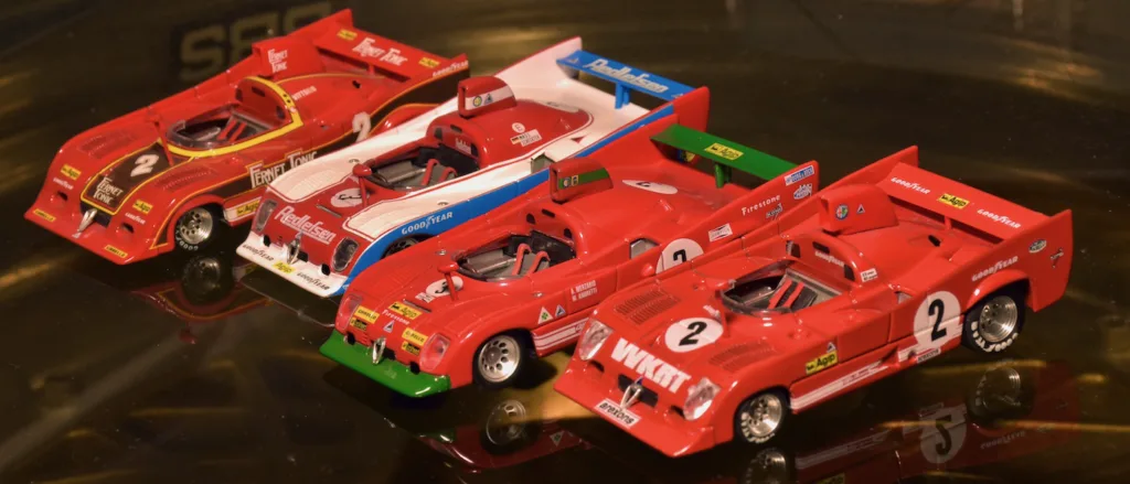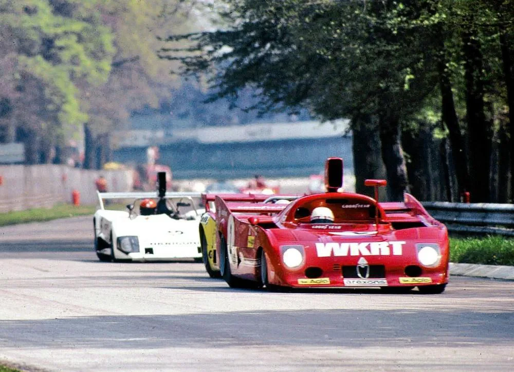1977 Monza 500 km, Alfa Romeo 33SC12. The 12 cylinder Alfa Romeo sports cars won the 1975 championship but did not compete in 1976, a season that was dominated by the new Porsche 936 turbo. In 1977, Porsche and Renault put all their effort in winning Le Mans. Alfa Romeo was back and the new 33SC12 that had an all new aluminium monocoque. It was the fastest car in the world championship by far, the only competition were some 2-liter prototypes. Alfa Romeo also experimented with a turbo engine, the 12-cylinder was reduced to 2.1 liter and received a turbo on each of the two cylinder banks.