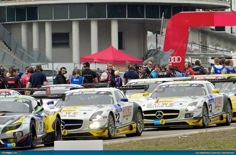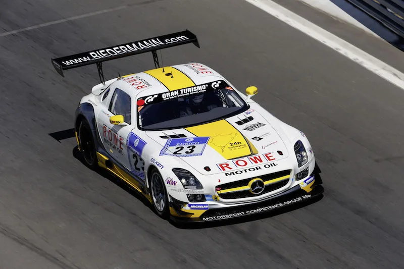2013 Nürburgring 24h, Mercedes-Benz SLS AMG. Motorsport Competence Group started racing in the VLN (the Nürburgring Endurance Championship) with support from oil company ROWE. They changed the name in ROWE Racing. In 2013 ROWE Racing participated with three SLS AMG GT3 in the 24-hour race, the cars finished 3rd and 4th and the third had a DNF. The race was won by a Black Falcon SLS AMG.