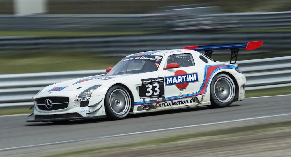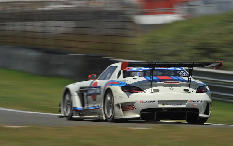 2014 Zandvoort 12h, Mercedes-Benz SLS AMG. Zandvoort hosted a twelve hour race in 2014. Problem is that the track is very near the city and submitted to all kinds of restrictions and permits. So 12 hours non-stop racing was no option, but the creative minds from Creventic and DNRT created a new format. 3 Hours racing on Friday and 9 on Saturday, without service in between. The grid was filled with local amateur drivers and international teams with fast GT3 cars. Dutchman Renger van der Zande won together with his team mates in this beautiful Mercedes in Martini livery.