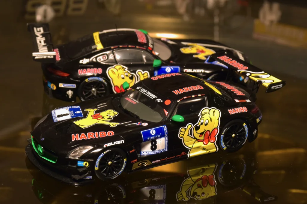 2015 Nürburgring 24h, Mercedes-Benz SLS AMG. The Nürburgring 24-hour race is one of the toughest and most spectaculair events of the season. This Haribo Mercedes retired after just over 5 hours, it managed to reach the pits after a crash but was too much damaged to continue. The race was won by the WRT Audi R8 LMS, best Mercedes was the Black Falcon in fifth spot.