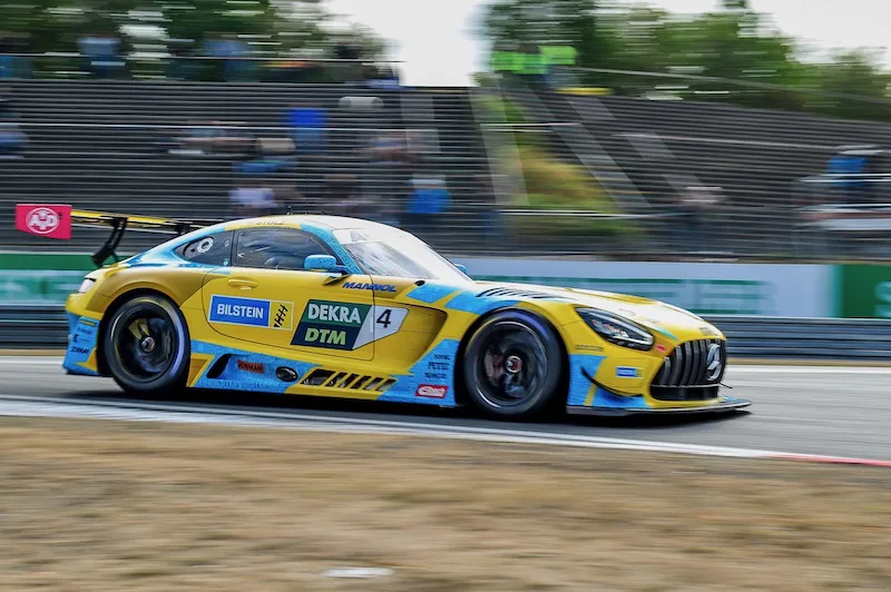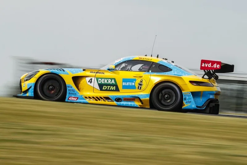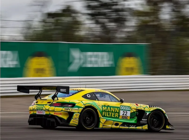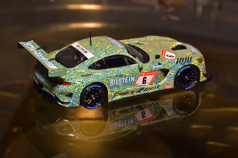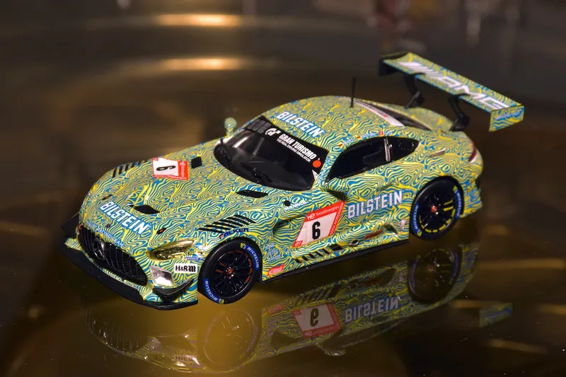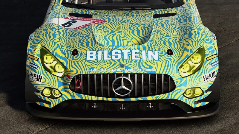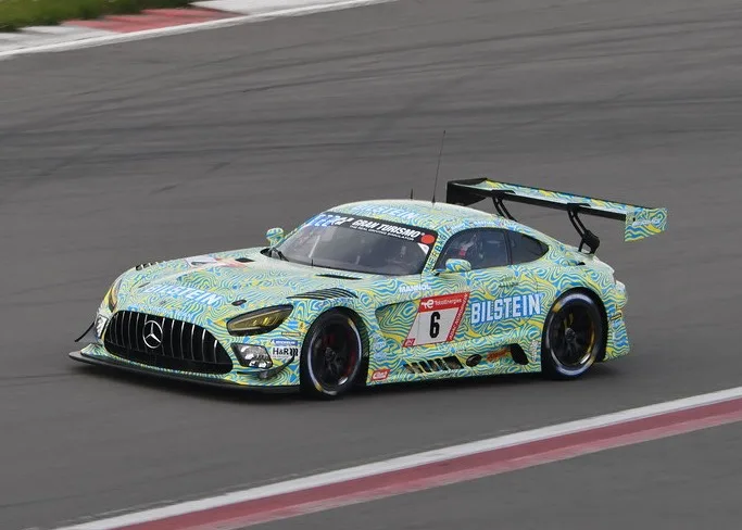 2022 Nürburgring 24h qualifier – Mercedes AMG GT3 evo. Two qualifier races are held to determine the teams that are allowed to enter the big race. The #6 HRT Mercedes appears in a very special ‘camouflage’ livery. From a distance, the Bilstein blue and yellow combined looks like green.