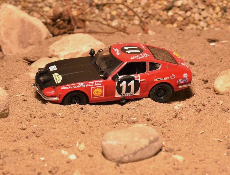 1971 Safari rally, Datsun 240Z. The first Japanese successes in rally were achieved in the East African Safari Rallye, this year’s round 4 of the World Rally Championship. Under these conditions not only speed, also reliability and self control of the drivers are the keys to success. The best car under these conditions was the Datsun 240Z. Herrmann and Schüller won in front of their teammates Mekha and Doughty.