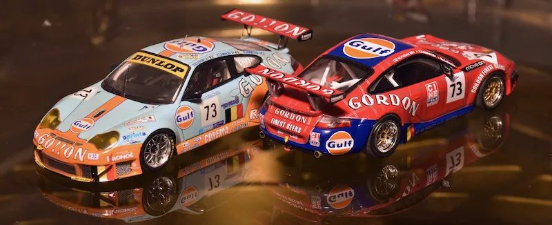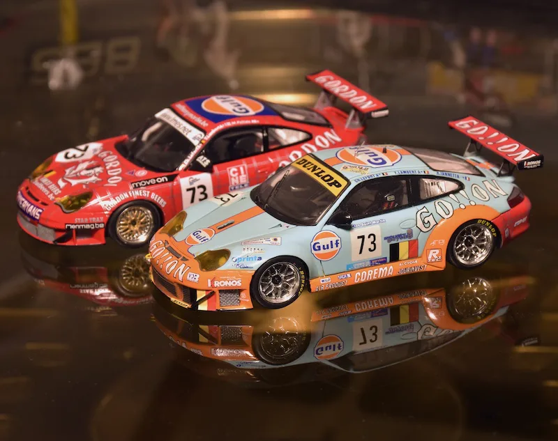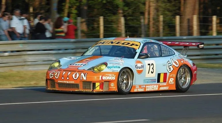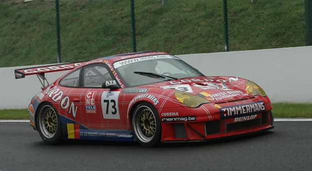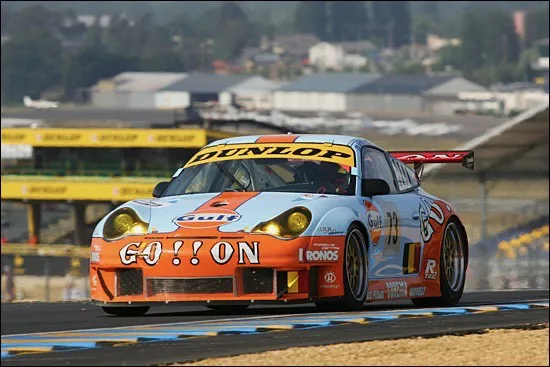 2005 Spa-Francorchamps 1000km, Porsche 911 GT3 RSR. The Gordon / Gulf sponsored GT3 RSR finished 4th at the wet track of the LMES round at Francorchamps in 2005. Surpising winners was the LNT TVR. In 2006 this car drove at Le Mans in the famous Gulf livery.