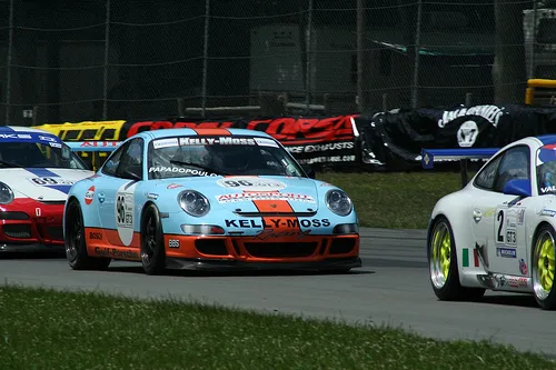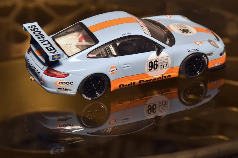 2006 IMSA Porsche GT3 Challenge, Porsche 911 GT3. The Porsche GT3 Challenge is very popular in the USA also, however it’s not an official Carrera Cup. These Porsche GT3’s have a support race before the ALMS series. The Kelly Moss cars are all painted in historic Porsche liveries such as this beautiful Gulf colored car.