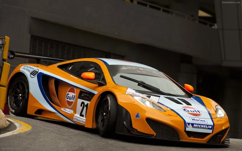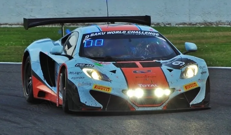 Gulf Racing McLaren MP4-12C GT3 – 3.8 liter McLaren M838T twin turbo V8, approx. 550 hp. Pirelli tires. Weight 1250 kg. Carbon fibre monocoque, chassisnr. #009