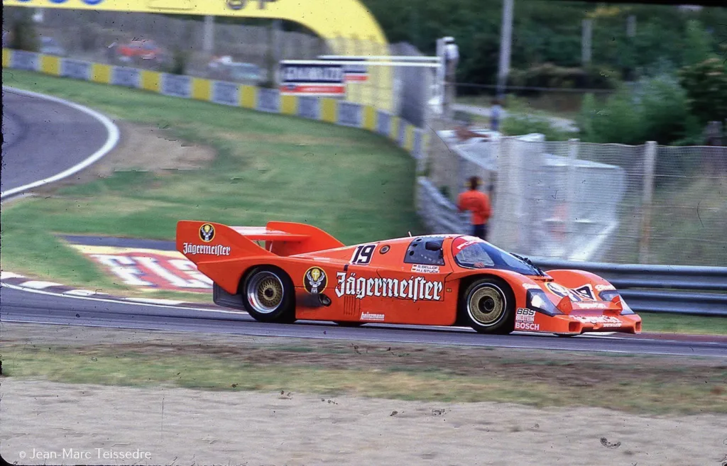 1984 Imola 1000km, Porsche 956B. Walter Brun took over the team from GS Tuning in 1983. He renamed the team to Brun Motorsport and continued the first year with the cars that GS raced before. In 1984, Brun received sponsorship from Jägermeister and bought a Porsche 956 that he entered in the World Championship and the DRM (German Sportscar championship). This is a 956 with an additional front spoiler as used by the Canon team the first time at Brands Hatch. The sideways drifting picture I took in the old bus stop chicane at Spa-Francorchamps 1984.