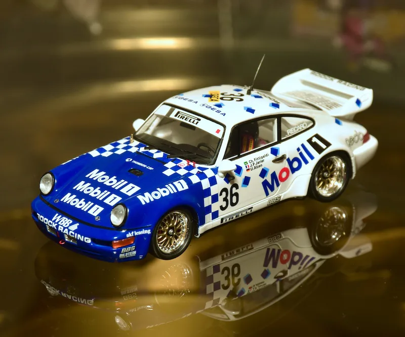 1993 Spa-Francorchamps 24h, Porsche Carrera RSR. The 24-hour race at Spa has been a touring car event for many years, but getting full starting grids became more and more problematic. So since last year also GT’s were allowed. Some 25 Porsche 911 joined. Because the Porsche were a lot quicker than the local ‘procar’ touring cars, these got a restrictor on the fuel inlet that made their pitstops about twice as long. The race was red flagged after 15 hours, because the Belgian king had died that night … The shortened race was won by the Roock Porsche in Mobil1 livery with a great driver line-up. The first 6 spots were for Porsches.