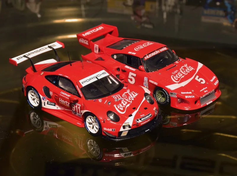 2019 Road Atlanta – Petit Le Mans, Porsche 911 RSR-19. In 2019 the Porsche factory teams used some historic liveries on their 911 RSRs. At Le Mans the cars ran in Pink Pig and Rothmans colors and in the USA, it was the red, white and blue of Brumos and this historic Coca Cola outfit.