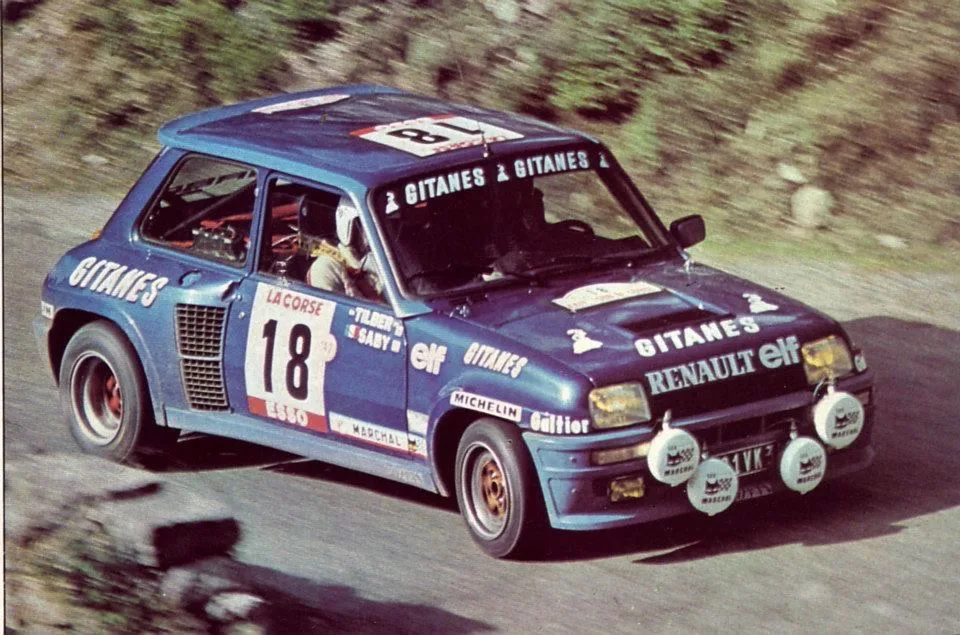 1980 Tour de Corse, Renault 5 turbo. The small Renault 5 turbo was a competitive rally car in the early 1980s before the powerful AWD group B cars arrived. In the 1980 Tour de Corse, Bruno Saby managed a fine 4th place behind two Porsche 911 and a FIAT 131 Abarth.