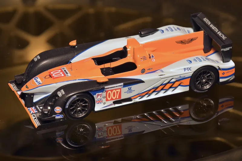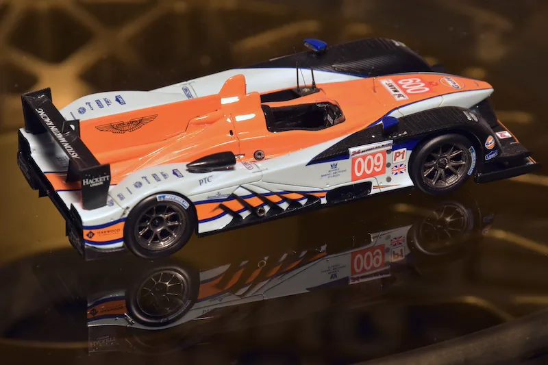 2009 Le Mans 24h, Aston Martin DBR 1-2. After the success of last year’s Charouz Lola, Aston Martin entered LMP1 with a complete factory team. However the car was somewhat different from the 2008 version, the ACO refused to homologate it as an Aston Martin, so it officially remained a Lola. They had no chance against the diesels from Peugeot and Audi, but the best AM finished 4th, best of the rest. The car with the fastest line up (Verstappen, Davidson and Turner) only finished ninth. They had to drive an updated 2008 chassis because Verstappen destroyed the 2009 one during testing. The scalemodel of the #009 is the slightly different presentation version.