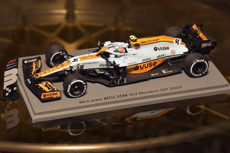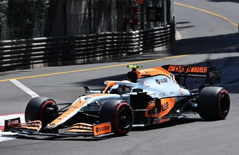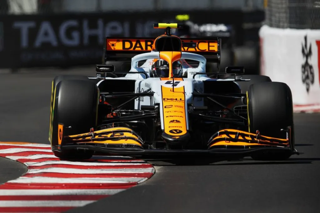 2021 Monaco, McLaren MCL35M. McLaren F1 struggled some years, first with Honda power and later on with the Renault engine. Now they have access to the powerful Mercedes power unit, the team is competitive again. For the Monaco Grand Prix the cars wore the famous blue and orange Gulf livery. Norris finished third on that occasion.