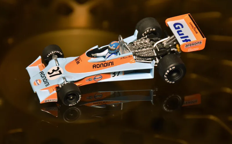 Rondini Tyrrell 007 – 3.0 liter Ford Cosworth DFV V8 90º, approx. 500 hp. Goodyear tires. Weight 625 kg. Aluminium monocoque, chassisnr. #007/4