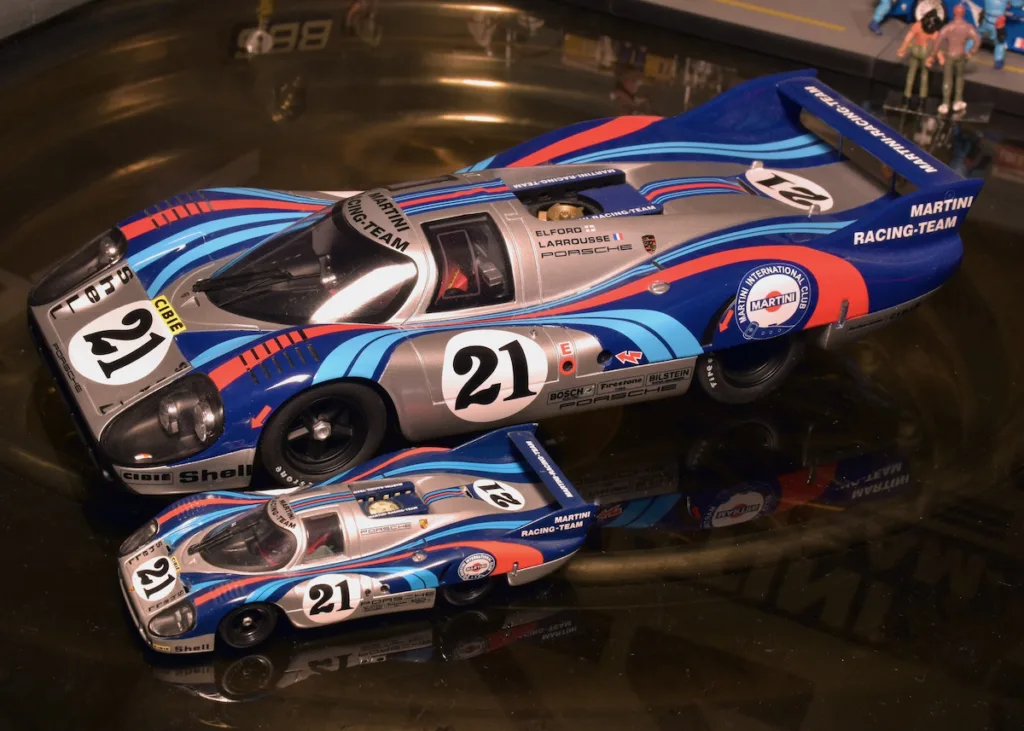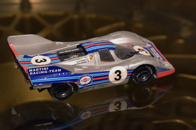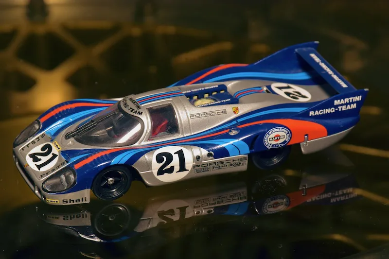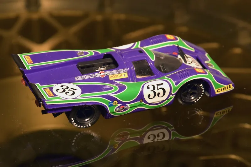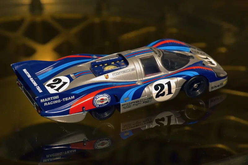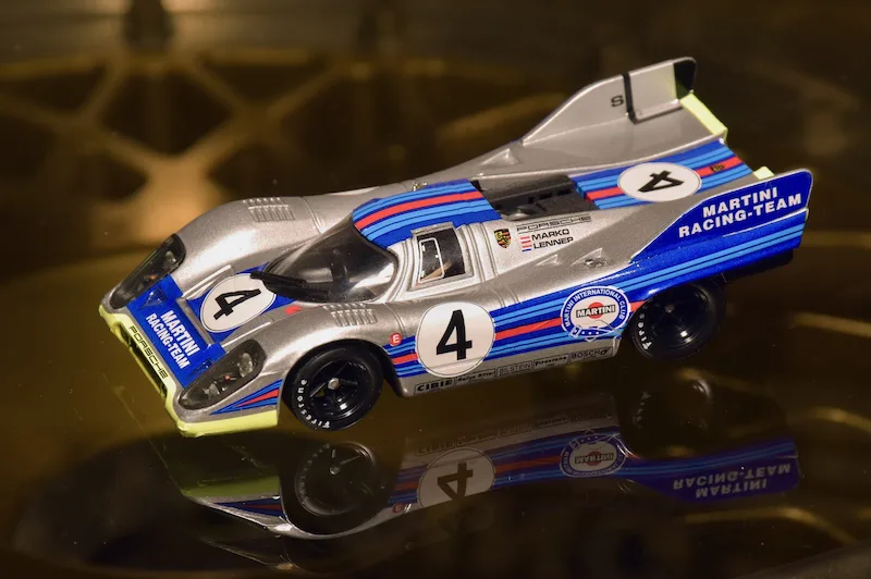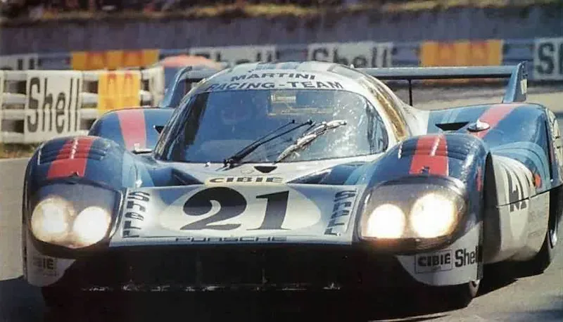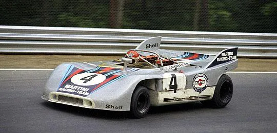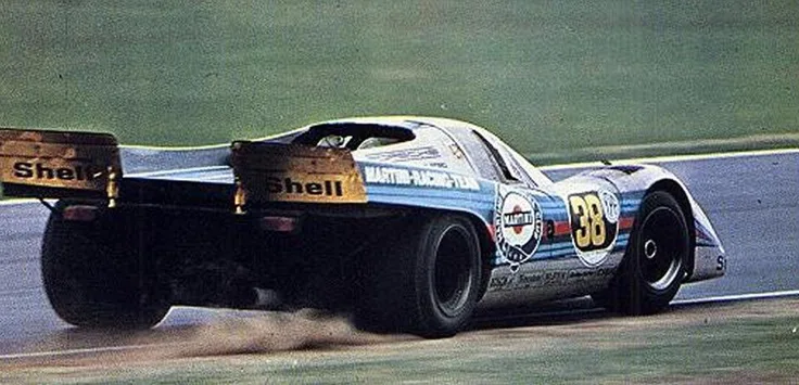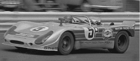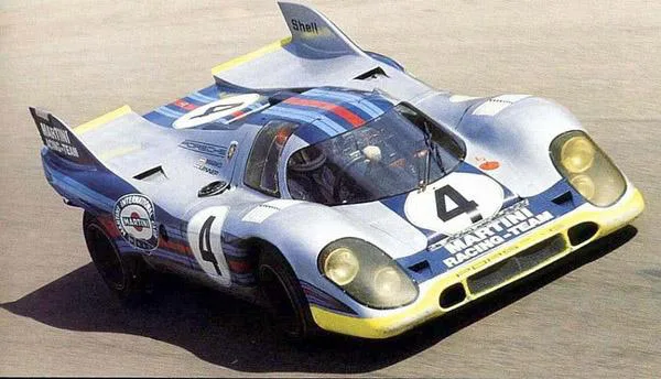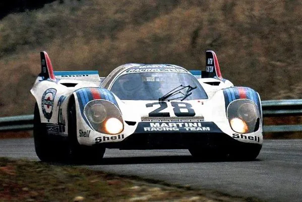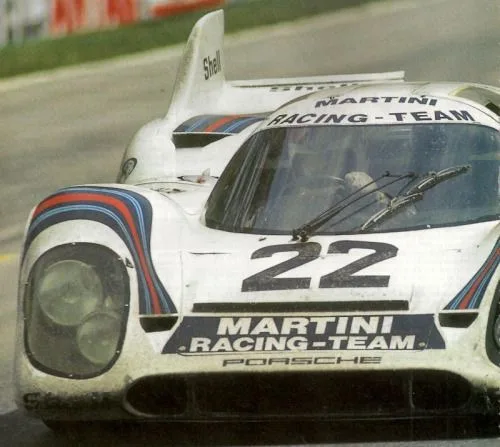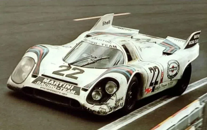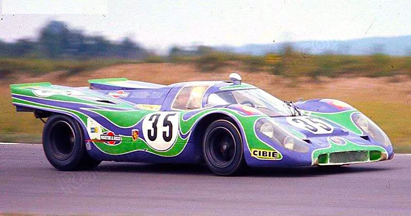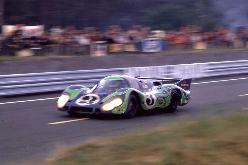 1970 Le Mans 24h, Porsche 917L. Martini Racing International was one of the two teams that entered a long tail Porsche 917 for Le Mans. The car was white, designer Anatole Lapine painted the purple swirls on it just in time for qualifying, before the race the bright green was added. The exceptional high topspeed of 380 km/h couldn’t be used in the pouring rain.