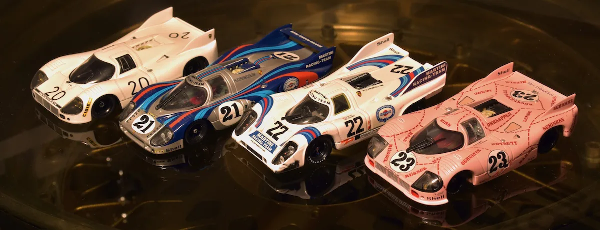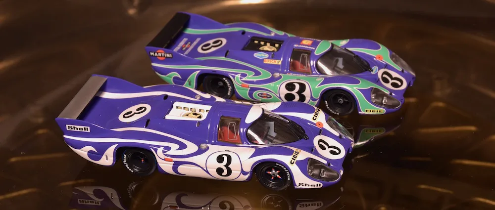 1971 Monza 1000km, Porsche 917K. The fifth race of the world championship was at Monza. Elford and Larrousse took pole position, sadly they already had a bad start and to retire after problems with the throttle linkage. Van Lennep and Marko retired 16 laps later with exact the same problem. The race was a double victory for the rival JWA Gulf team. The Monza cars have the typical fins at the rear that are not on the Sebring version.