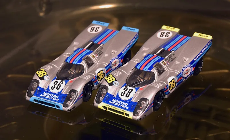 Martini Racing Porsche 917K – 4.5 liter Porsche 912.10 V12 180º, approx. 570 hp. Firestone tires. Weight 810 kg. Aluminium space frame, chassisnrs. 917 #019 & #023