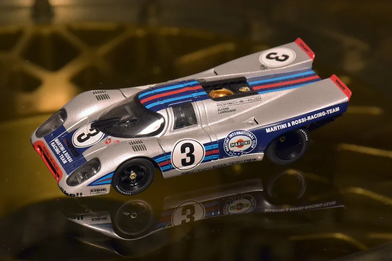 Martini Racing Porsche 917K – 4.9 liter Porsche 912.10 V12 180º, approx. 600 hp. Firestone tires. Weight 800 kg. Magnesium space frame, chassisnr. 917 #044