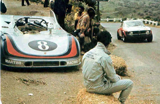 1971 Targa Florio, Porsche 908/03. Martini Racing also used the 908/03 at the Targa Florio and Nürburgring. But the new Alfa 33/3 was capable of beating them on their own terrain. Elford crashed and had to retire the Martini Porsche.