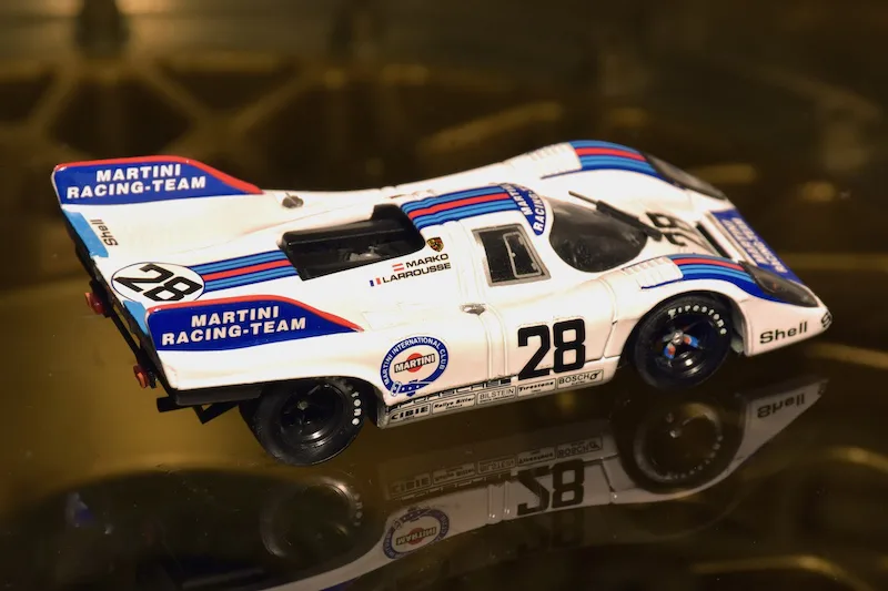 1971 Le Mans 24h, Porsche 917L. Martini Racing entered 3 cars for the race, all three having other body work. The #21 was a 917L (for long tail) which were somewhat different from last years car; the front end looked a bit like that from the 917/20 “pig”. Three of these cars entered the race (1 Martini, 2 Gulf) but all failed to finish. This one suffered a broken cooling fan and overheating problems.