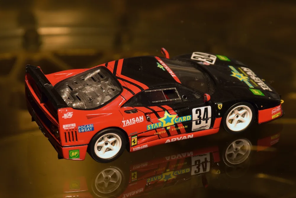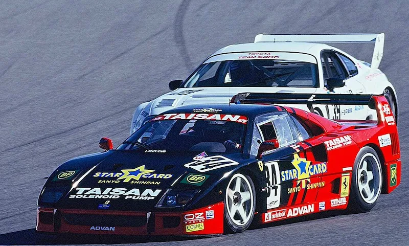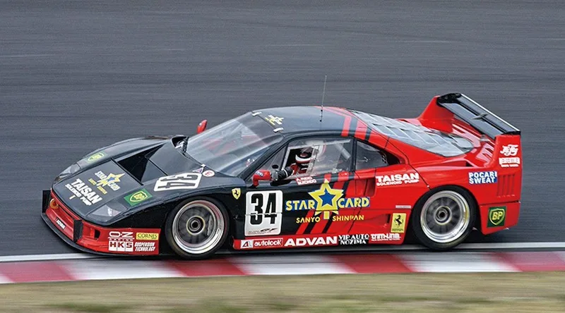 1994 Japanese GT Championship Mine, Ferrari F40 GT. 1994 Was the second year of the Japanese GT Championship. The grid was a miraculous mix of exotic cars: Lots of Nissan Skylines, but also Porsche GT2 and a former group C 962, Toyota Supra and a Ferrari F40. The former Jolly Club F40 was entered by Team Taisan and won the final race of the season at Mine. In that race, Team Taisan even entered this second F40 in the well known black and red Yokohama livery.