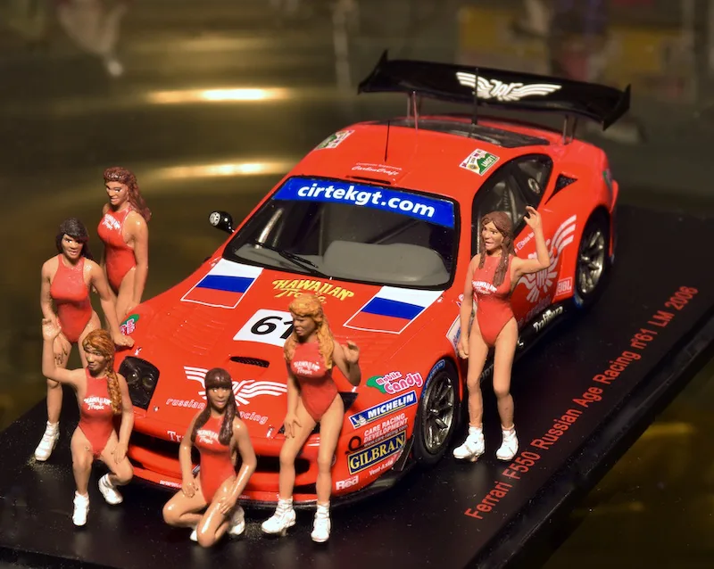 2006 Le Mans 24h, Ferrari 550 GTS Maranello. One of the privately entered Maranello’s is this from Cirtek Motorsport with last year’s car, but now in red with an all British driver line-up. The famous Hawaiian Tropic sponsoring remained. I bought this model online and the Hawaiian Tropic girls in the red bathing suits were already attached to the base plate 😉