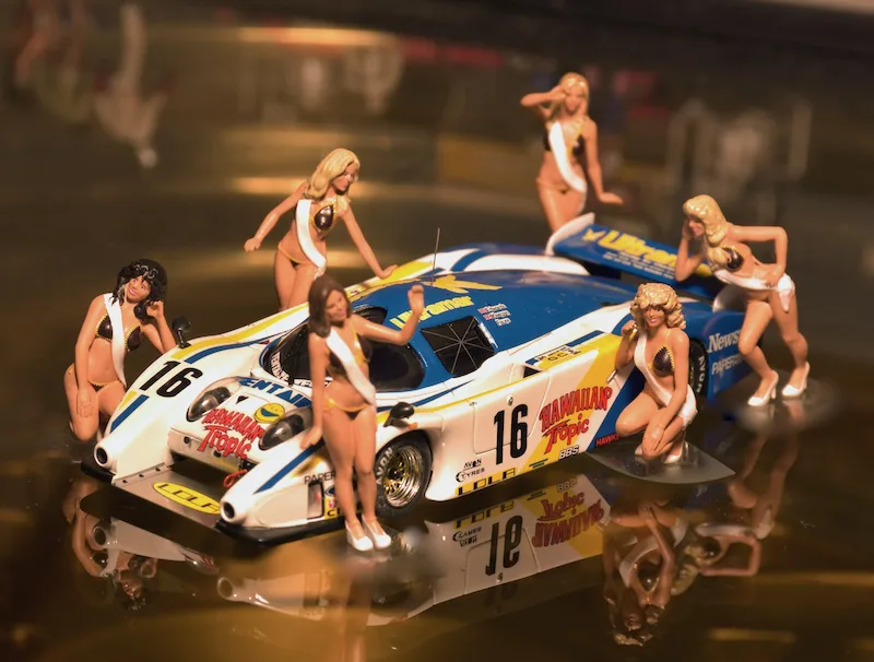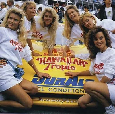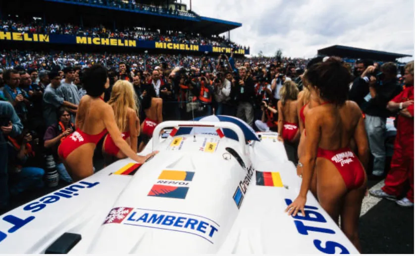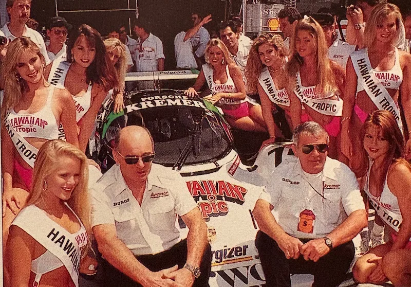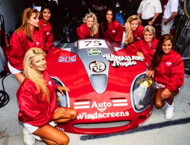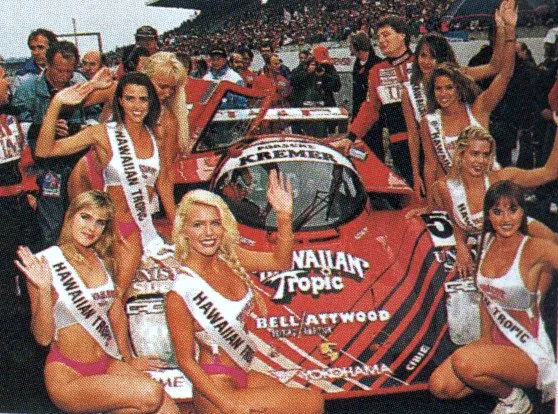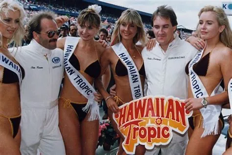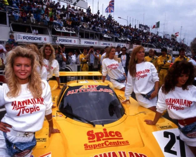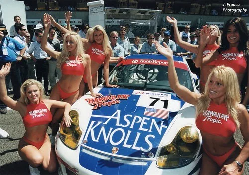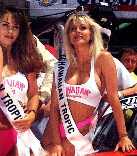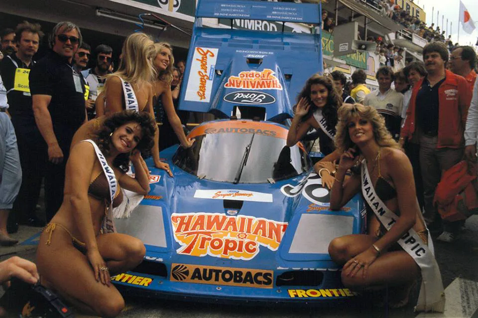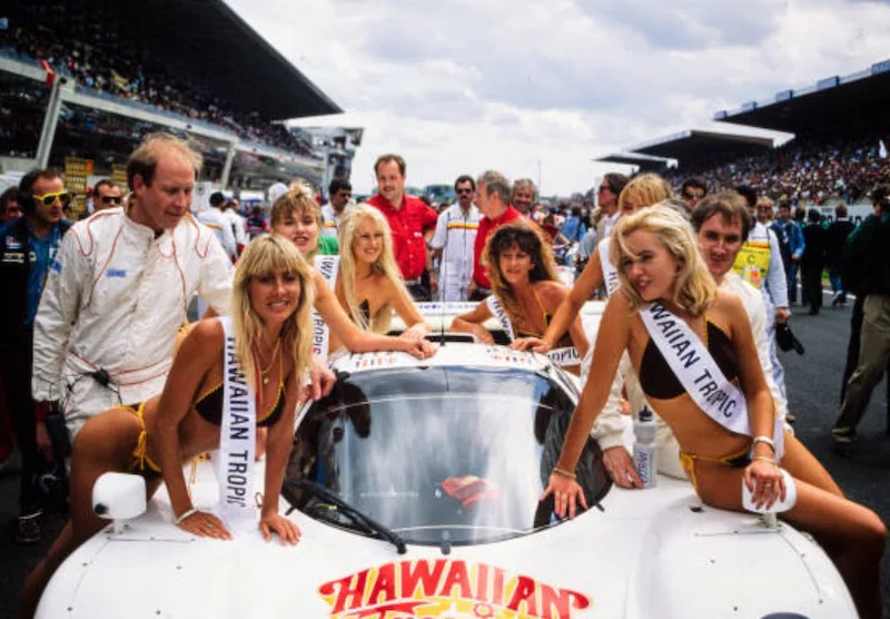 Hawaiian Tropic, producer of sun screens started sponsoring Le Mans cars and what better way to attract attention than to add some sexy ladies. In the first 10 years the ladies wore brown knitted bikini’s.