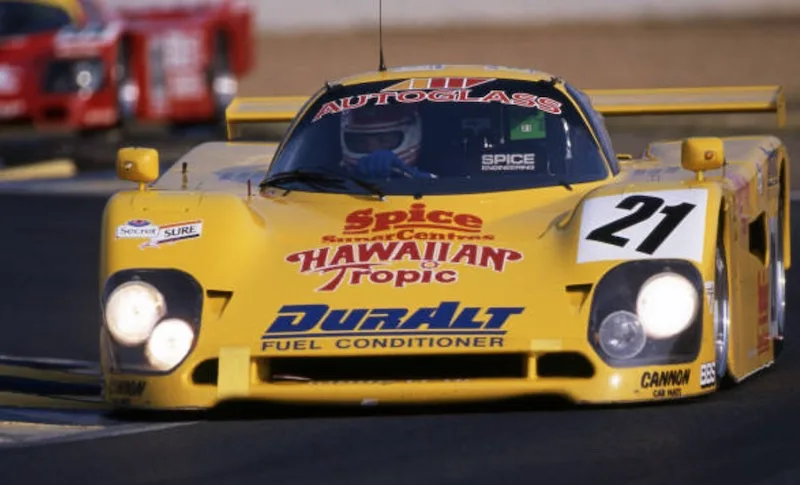 1989 Le Mans 24h, Spice SE89C. Gordon Spice entered this bright yellow SE89C in C1, which he drove himself with Ray Bellm and American female driver Lyn St.James. Unfortunately, the engine seized. The same happened to the sister car with #22. Three older Spice cars drove in C2 and finished 2nd, 3rd and 4th in class.