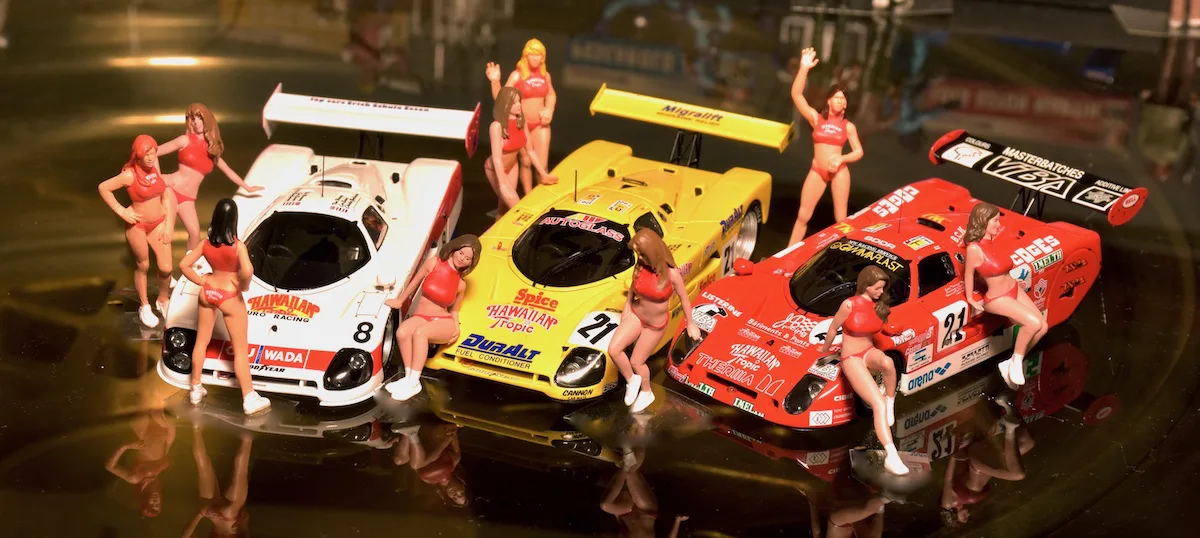 Hawaiian Tropic, producer of sun screens started sponsoring Le Mans cars and what better way to attract attention than to add some sexy ladies. In the first 10 years the ladies wore brown knitted bikini’s.