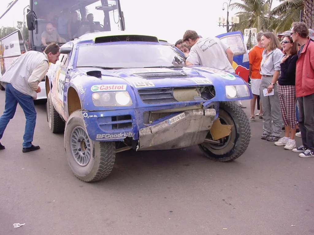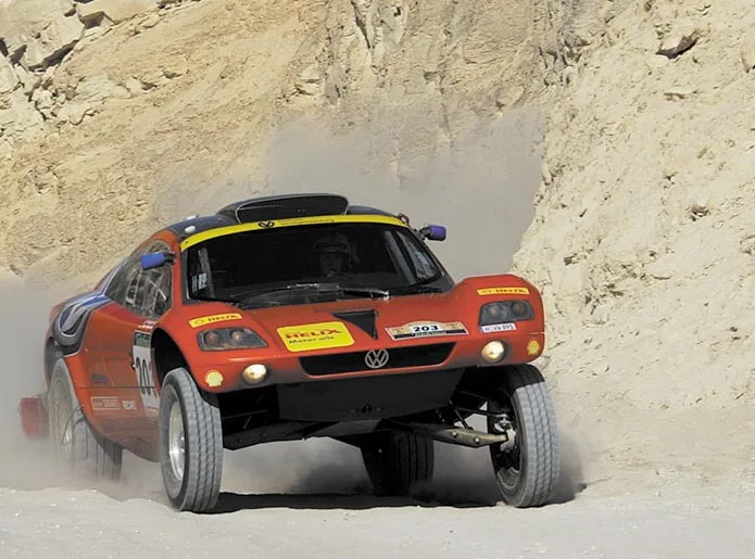 2003 Marseille – Sharm el Sheikh, VW Tarek. In 1980, Volkwagen won the second Dakar with the factory entered Iltis. In 2003 the brand returned to Dakar with this Tarek buggy. It had the looks of the W12 concept car, but was equiped with a 1.9 liter TDI turbodiesel engine with only 220 bhp and had rear wheel drive only. This was compensated by a low weight and great torque. VW entered 5 cars among which this with Kleinschmidt and Pons who won the race in 2001 with Mitsubishi. From 2004 VW would use the 4WD Touareg.