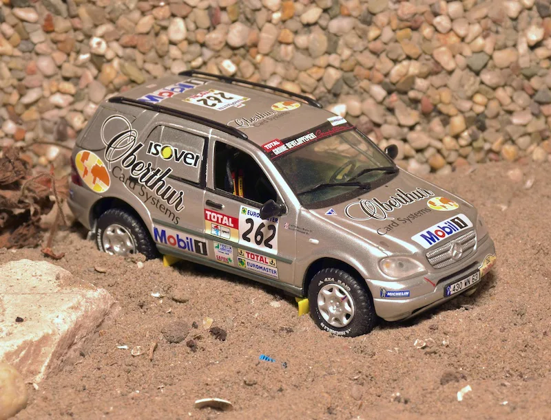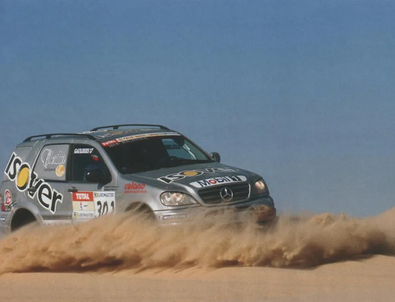 2000 Dakar – Cairo, Mercedes-Benz ML430. Former Formula 1 driver Philippe Alliot was also attracted to the desert (just as Ickx, winner Schlesser, Pescarolo, Regazzoni and Lafitte before him). He did pretty well finishing 6th in Dakar 1998 and a stage win in the 1999 Pharaoh Rallye. He competed in the Marathon category with this Mercedes ML 430, but retired on the third day. I can’t find a photo so I added some from other ML from the same year …