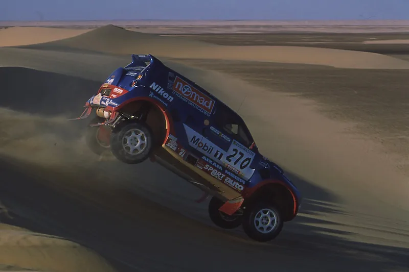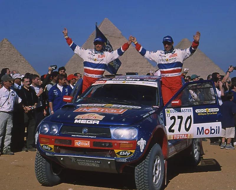 2000 Dakar – Cairo, Aixam Mega. Stéphane Peterhansel is one of the real great Dakar heroes. He had won the bike category no less than 6 times before he turned to cars. He won the 24 hour of Chamonix on snow and ice in 1998 and made his Dakar debut on 4 wheels in a Nissan in 1999. In 2000 he drove a Mega Desert, a car from a small French constructor that usually builds small city cars. Just like the winning Schlesser, it was a light car with only rear-wheel drive.