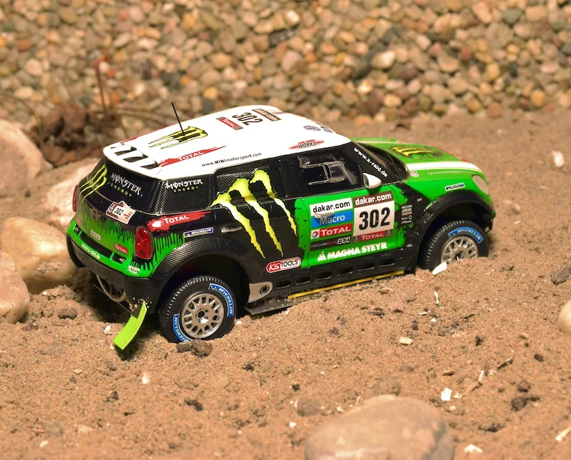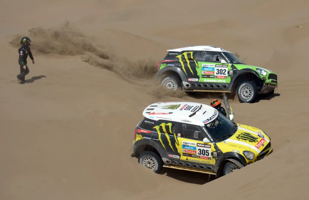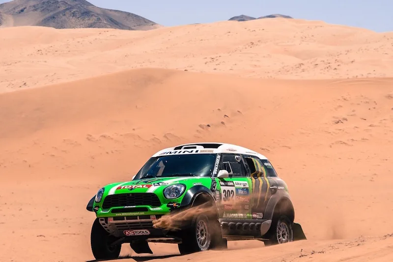 2013 Argentine – – Peru, MINI All4 Racing. Stéphane Peterhansel was already a hero before he started racing cars in Dakar after he won the event on a motorcycle 6 times. His 2nd attempt came close: second in 2000 with the Mega. He won it three times with a Mitsubishi and joined the X-Raid team in 2010. X-Raid built the BMW X5’s and X3 CC and based upon this last one, the MINI 4All Racing. It uses the same strong BMW 6-cilinder turbodiesel engine that delivers 800 Nm torque. Peterhansel won Dakar with it in 2012 and 2013.