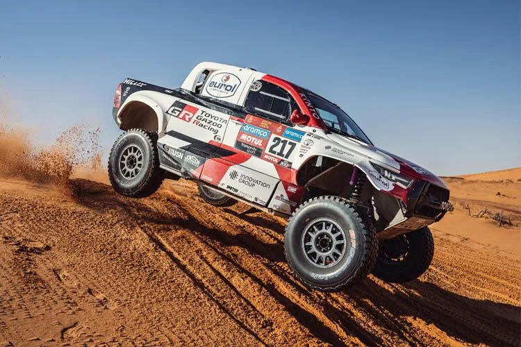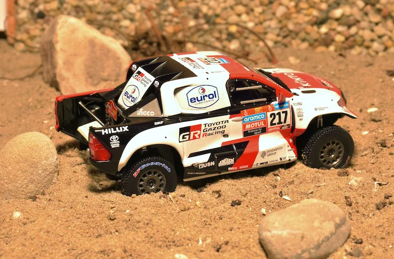 2023 “Dakar” Saudi Arabia, Toyota HiLux. The Toyota HiLux has been a contender for many years, having won the rally four times by now (2019, 2022, 2023 and 2025). Just as the other makes, the Toyota developed over the years. The cars have become bigger and the tracks have become much wider, the normally aspirated V8 made place for a smaller and lighter V6 twin turbo. South African Henk Lategan drove this car to fifth in the 2023 Dakar. Nasser al Attiyah won the event in a similar car.