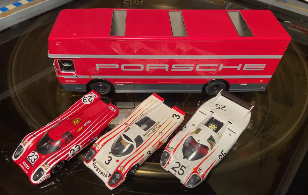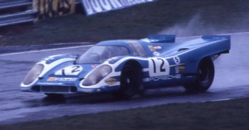 1970 Brands Hatch 1000 km, Porsche 917K. Porsche Salzburg battled with the succesful Gulf team al season. In the rain soaked race at Brands Hatch, the Salzburg cars finished 2nd and 3rd behind a Gulf 917. #12 Richard Attwood & Hans Herrmann finished 3rd. Second place was for Elford and Ahrens, who drove the complete white 917K this race.