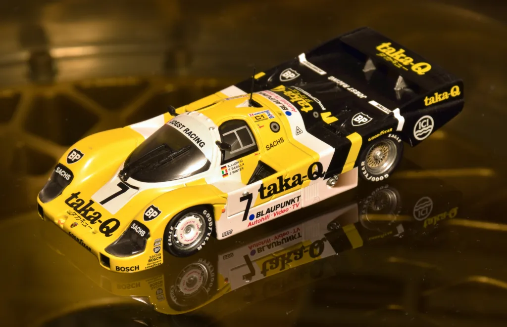 1986 Le Mans 24h, Porsche 956B. After being succesful in 1984 and 1985, Joest tried to win Le Mans for the 3rd time with the chassis #117 Porsche. The livery looked the same as before, but now the main sponsor was Japanese Taka-Q. But this time the engine failed and the famous yellow and black Porsche had to retire.