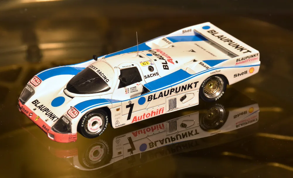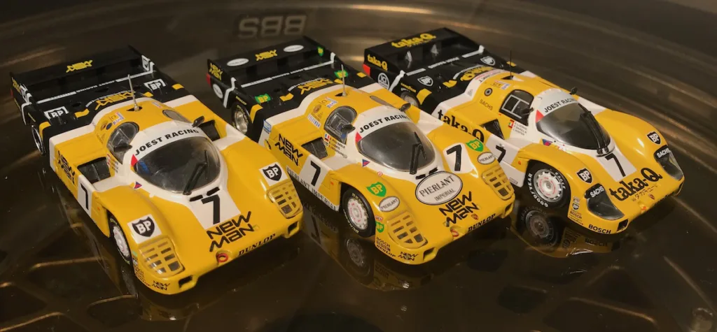 1989 Le Mans 24h, Porsche 962C. Again the Joest Porsches were best of the rest behind the two Mercedes Saubers that won the 24 hour race. The pink #9 finished 3rd, Wollek and Stuck drove the entire race, as former winner “John Winter” (real name Louis Krages) did not drive at all. And the blue Blaupunkt car with the all Franch driver trio finished 6th.
