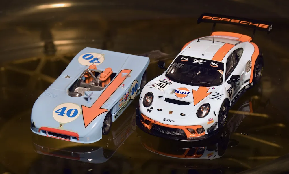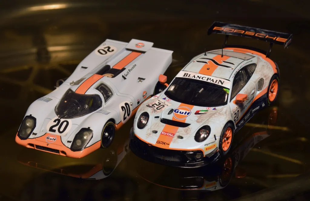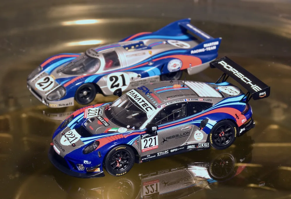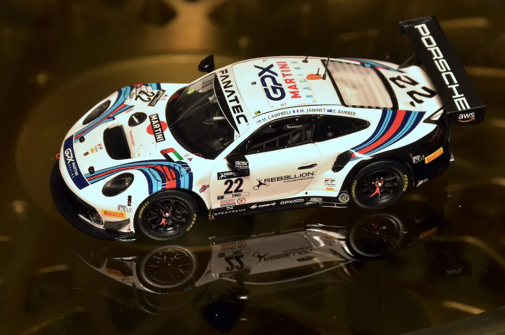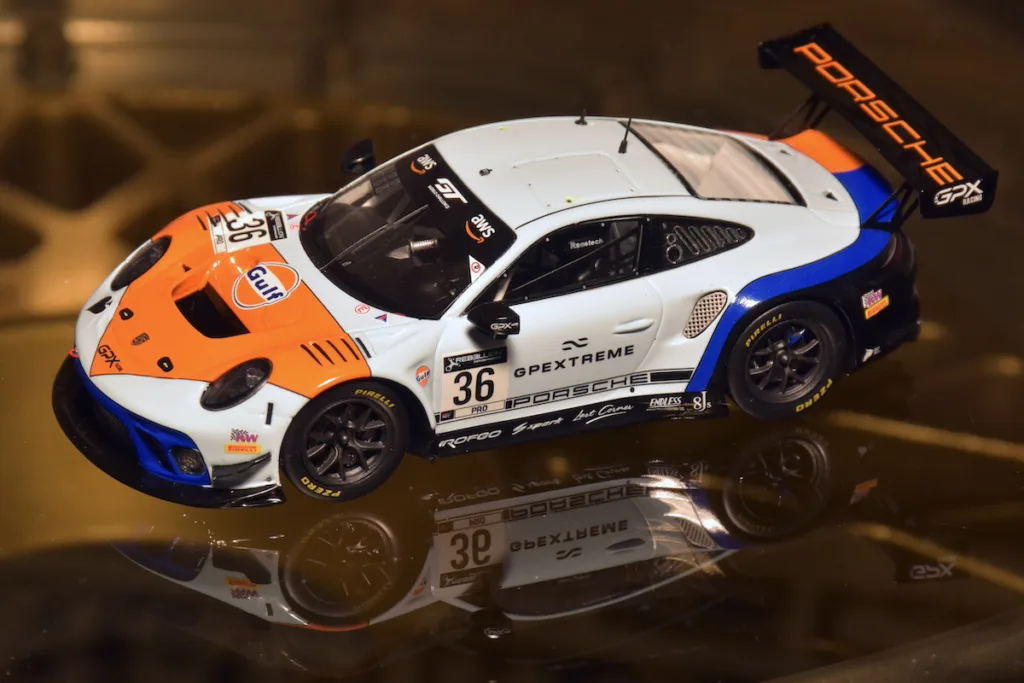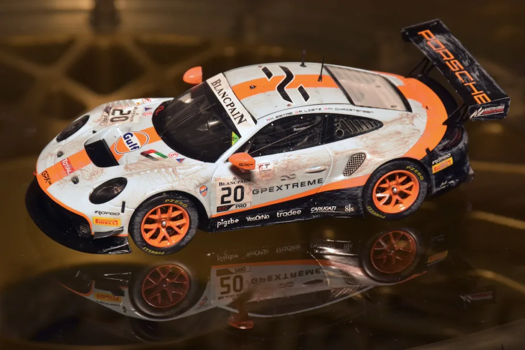 2019 Spa-Francorchamps 24h, Porsche 911 GT3 R (991). The GPX Porsche had the same colors as the famous Porsche 917K #20 that raced in 1970 and featured in the movie “Le Mans”. Three Porsche works drivers drove it to victory in the rain soaked Spa 24-hour race.