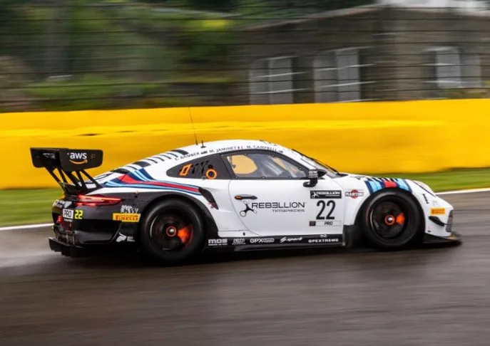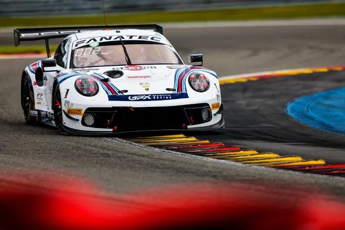 2022 Spa-Francorchamps 24h, Porsche 911 GT3 R (991). The Martini livery doesn’t bring the success that the Gulf had for GPX. In the 2022 Spa 24-hour race the team had to retire again. During the test, the car had a different and very flashy color scheme.