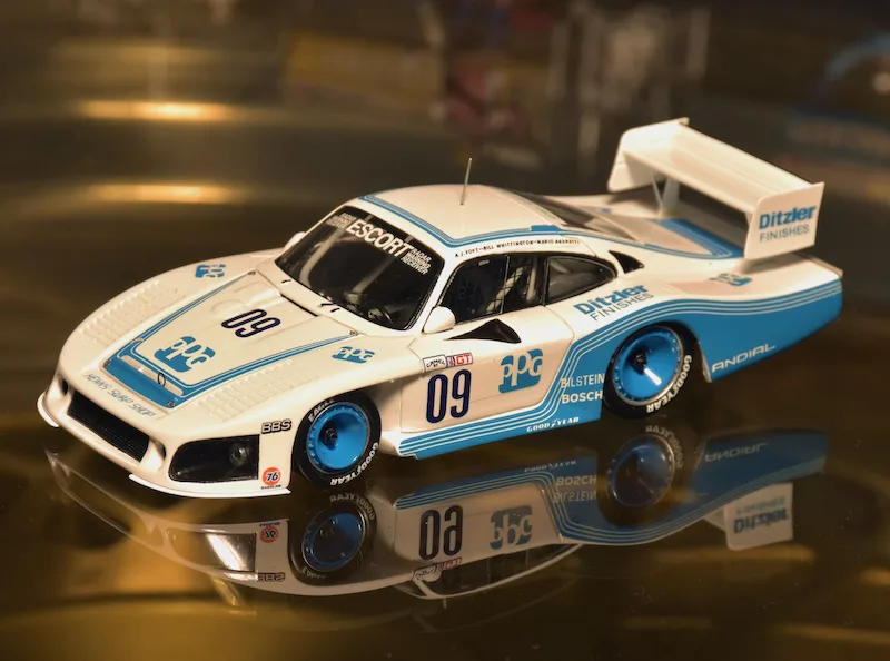 1978 Daytona 250 miles, Porsche 935/77A. Interscope Racing, from entrepreneur Ted Field, raced the Porsche 935 in the 1978 season as a replacement of the RSR turbo. Usually they use #0 but sometimes a 2nd car is entered with #00, such as this one driven to 2nd place in the 250 mile race at Daytona by Danny Ongais. Winner was Peter Gregg in the Brumos 935.